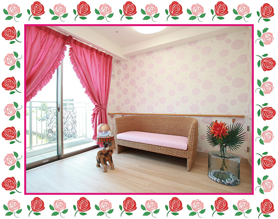 あたたかなピンク色のカーテン・壁紙に彩られた部屋でアロマを焚いてゆったりできます。